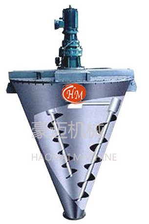 单锥双螺旋混合机,它由传动部分、筒盖、螺旋、筒体、出料阀等组成。