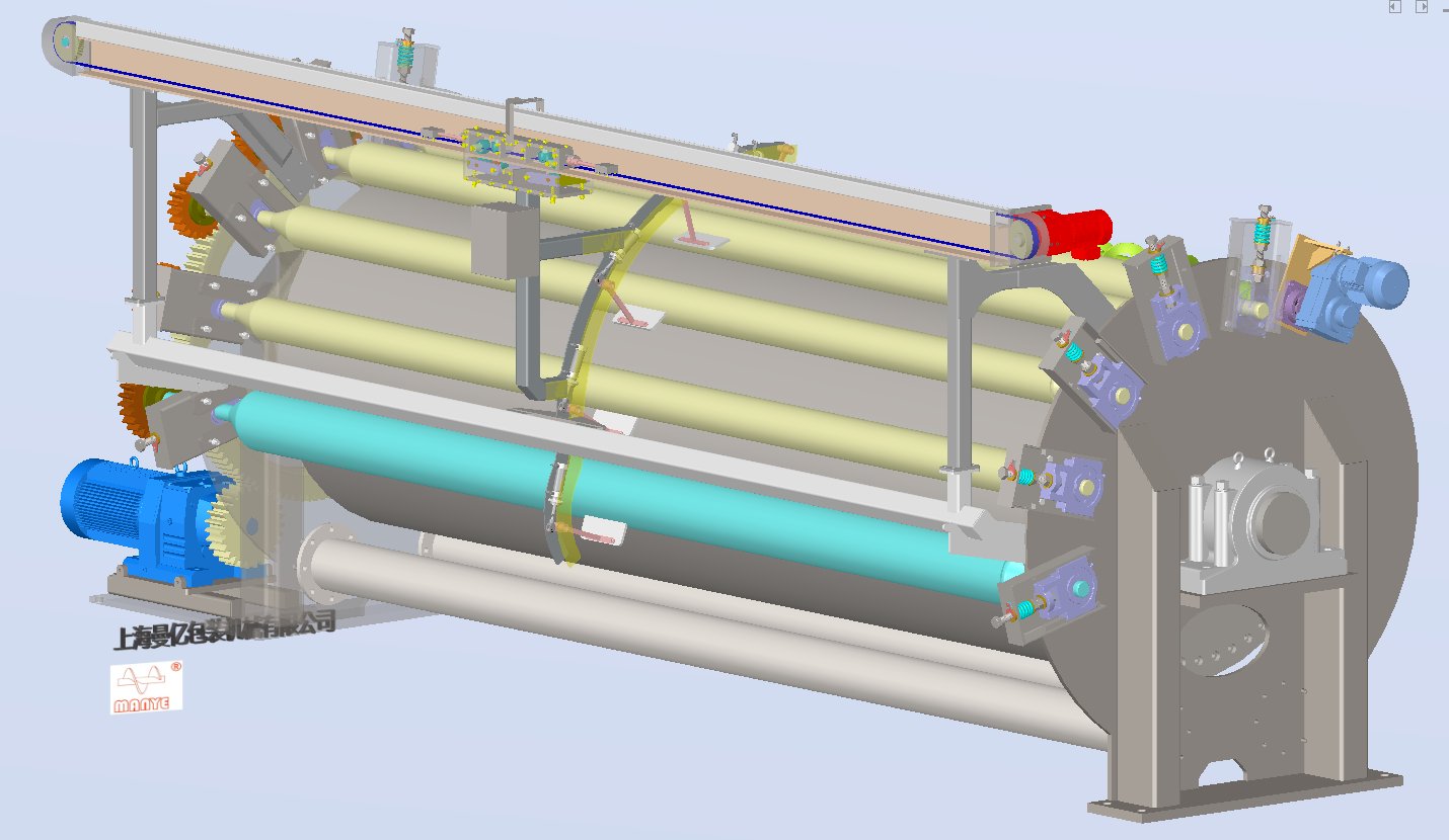 MY-01型雪花全封单辊筒干燥机主要由干燥机构、铲刀机构、水平搜集破碎机构、动力机构、排气机构、提升机、破碎机等组成。