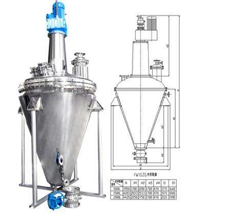 本机设备由不锈钢制立式容器、搅拌粉碎装置、卸料装置及控制装置、参气系统等组成。由防爆电机,经齿轮减速机,驱动双螺带搅拌器旋转,带动物料沿锥型筒壁旋转并自下而上提升,物料到达**点后由重力和惯性作用,自动流向旋涡中心回到锥型筒体底部,一系列过程使物料在锥型筒体内强制加热,相互扩散、对流、剪切、错位和掺混,使物料作全方位的不规则往复运动,完成物料同双螺带和筒壁表面进行高频率的传热交换;物料处于真空状态,蒸汽压下降使物料表面的水份(溶剂)达到饱和状态而蒸发了,并由真空泵及时排出回收。物料内部的水份(溶剂)不断地向表面渗透、蒸发、排出,三个过程不断进行,物料在很短时间内达到干燥目的。