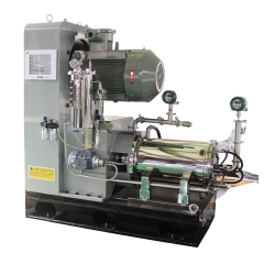 输送泵将经过预稀释搅拌后的液固混合原料泵入筒体内,主轴带动分散涡轮作高速旋转,并搅动筒体内的研磨介质(玻璃球,瓷球,氧化锆珠,氧化铝珠等), 使之产生旋流和径轴像运动从而对产品进行强化的研磨分散,使产品达到规定的细度和工作温度实行自动控制,保证整机的安全运转。 其间产品和研磨介质由动态出料间隙分离。