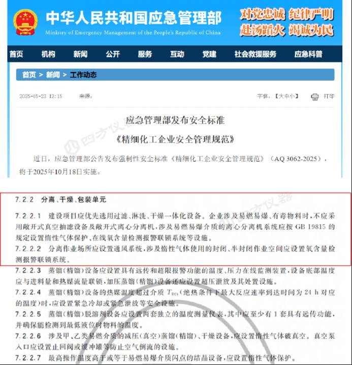 在精细化工生产过程中,离心机内部氧浓度的实时精准监测,已成为防范易燃易爆事故不可或缺的“感知神经"。随着《精细化工企业安全管理规范》(AQ 3062-2025)的正式实施,这项监测已成为强制