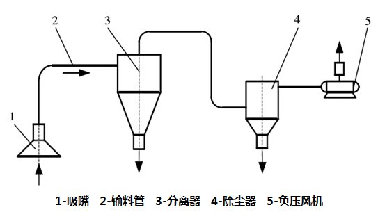 负压(吸送)输送系统是利用输送系统终点的风机抽吸系统内的空气,在系统中形成低于大气压的负压气流,物料与空气同时从吸嘴进入系统内并随气流到达系统终点,最后经过滤分离将空气排放到大气中。