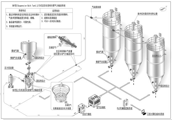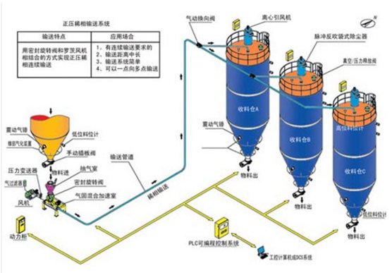 特点:正压输送主要用于将物料输送到一个或几个料仓的工况。与负压输送系统相比,正压输送系统具有比较高的容量并且适合于较远距离的输送。