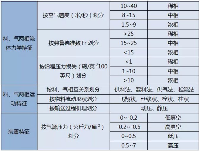 从气力输送实质考虑来分类,有按料、气两相数量比分类;按料、气两相流体力学特征分类;按料、气两相运动特征分类;按装置特征分类等几种分类法。按料、气两相数量比分类和按料、气两相流体力学特征分类,可将气力输送系统分为稀相、中相和浓相。按料、气相互关系划分,可分为供料法、混料法、供气法、栓流法。按物料流动形状划分,可分为飞翔状、丝缕状、栓状、柱状等。