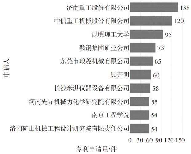 济南重工和中信重工分别位列第一和第二,申请量均超过100件;其次为昆明理工大学和鞍钢集团,前十名申请人主要分布在重工机械和高校研究设计院。
