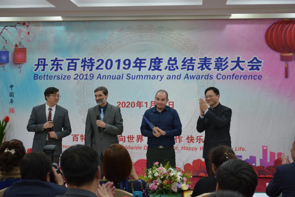 在“丹东百特2019年总结表彰大会”上,百特总经理董青云先生为亚历山大先生和法儒先生颁发了《技术培训高级资质证书》,并授予俄罗斯分公司销售团队“国际销售最佳团队”荣誉奖杯。在随后的致辞中,亚历山大先生对百特的企业文化、专业精神给予很高评价,对百特在远程沟通中的高效响应大加赞赏,对双方的合作前景充满信心。