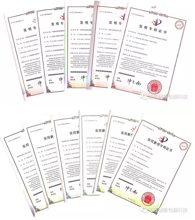 江苏创新包装科技有限公司2017年度获得4项发明专利和6项实用型专利,使公司共拥有发明专利5项、实用型专利21项。这些专利的取得是公司重视科技研发、公司科技人员勤奋工作的结果。这些专利技术正逐步应用到产品中,使我公司智能包装码垛线、定量自动包装机有更高的科技含量,不断提高了公司产品的品质,受到了政府