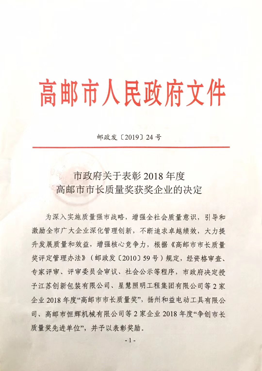 近日,高邮市人民政府发布了“市政府关于表彰2018年度高邮市市长质量奖获奖企业的决定”,的文件。文件中说决定授予江苏创新包装有限公司2018年度“高邮市市长质量奖”。 另悉,市长质量奖,全市仅2个名额。江苏创新包装有限公司曾获2017年度争创市长质量奖先进单位。 市长质量奖的评定是为了深入实施质量强