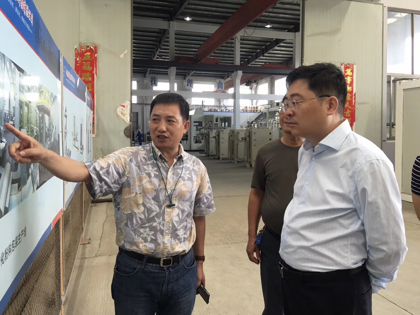 2018年8月28日,高邮市副市长王永海,市工信局局长王有泉,高邮镇人大主席韩非等一行莅临江苏创新包装科技有限公司调研考察。公司董事长方先其接待了来访并作了情况汇报。 通过调研,王副市长对江苏创新包装科技的运营和项目发展情况给予了充分的认可。王副市长希望创新包装科技积极推进创新创业工作更上一层楼。江