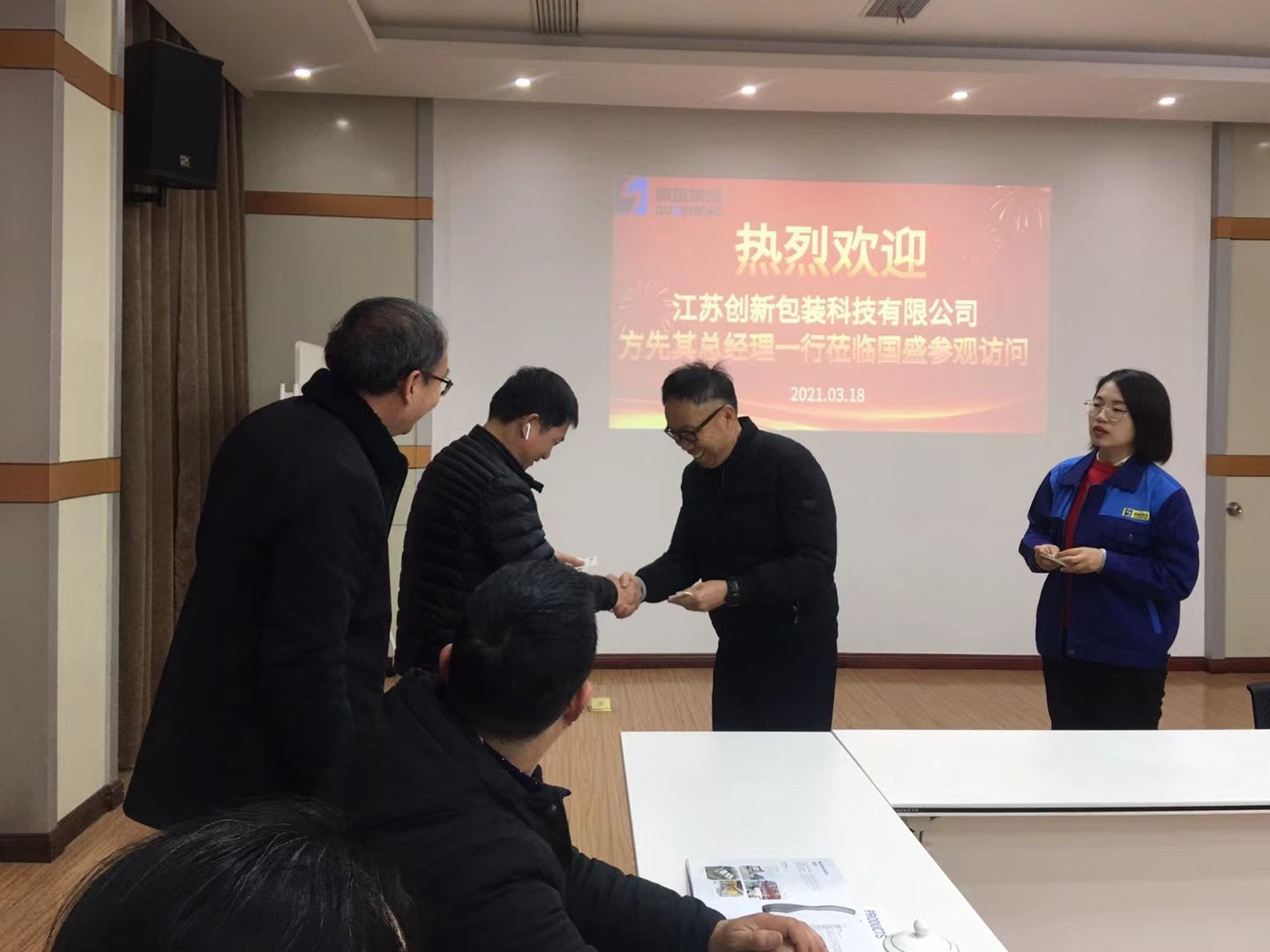 3月18日,江苏创新包装科技有限公司董事长方先其先生率领公司管理人员莅临南通国盛智能科技集团股份有限公司参观访问。南通国盛智能科技集团股份有限公司潘卫国董事长热情地接待来访一行。潘卫国介绍了国盛集团的成长历程、“创新与高效”的理念、经营管理经验等,方先其就创新包装的发展现状和未来趋势作了交流。主宾双