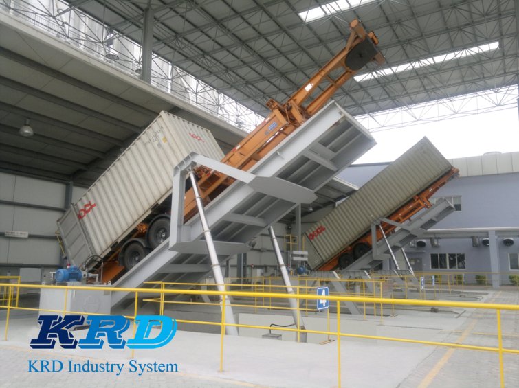 集装箱卸料平台用于将20英尺和40英尺集装箱固定在卸料平台上,选用尾部支点位置定位,通过液压油缸动力系统,实现集装箱后翻倾斜0°-65°的功能,平台在0°-65°范围内整体后翻转倾斜,实现物料从集装箱内缓慢的下滑出集装箱,并可以在0°-65°范围的任意位置停留。