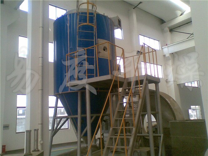 空气通过加热器转化为热空气,进入装置在干燥室顶部的热风分配器,然后均匀地进入干燥室内,同时将料液经由螺杆泵送至装置在干燥室顶部的离心雾化机,形成极小的雾状液滴,使料液和热空气并流接触,水份迅速蒸发,在极短的时间内干燥为成品,大部分粉状产品经过下锥体收集并打包。湿空气经过排风管道进入旋风卸料器,卸下湿空气带出来的小部分产品后,经由布袋除尘器(或者水膜除尘器)排空。