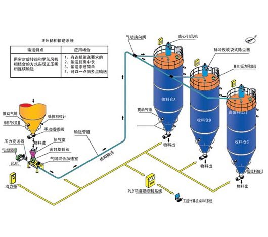 正压稀相气力输送系统也称正压气流输送系统或者是气运输送系统,他们都是以鼓风机(如罗茨风机)输出的气流为载体将散装粉粒体物料用气流输送进入指定的设备, 通过旋转加料器或螺旋给料器将粉粒体物料卸入管道进行压送.输送压力根据工况不同并根据物料不同,可在几千帕到几百千帕范围内调整。