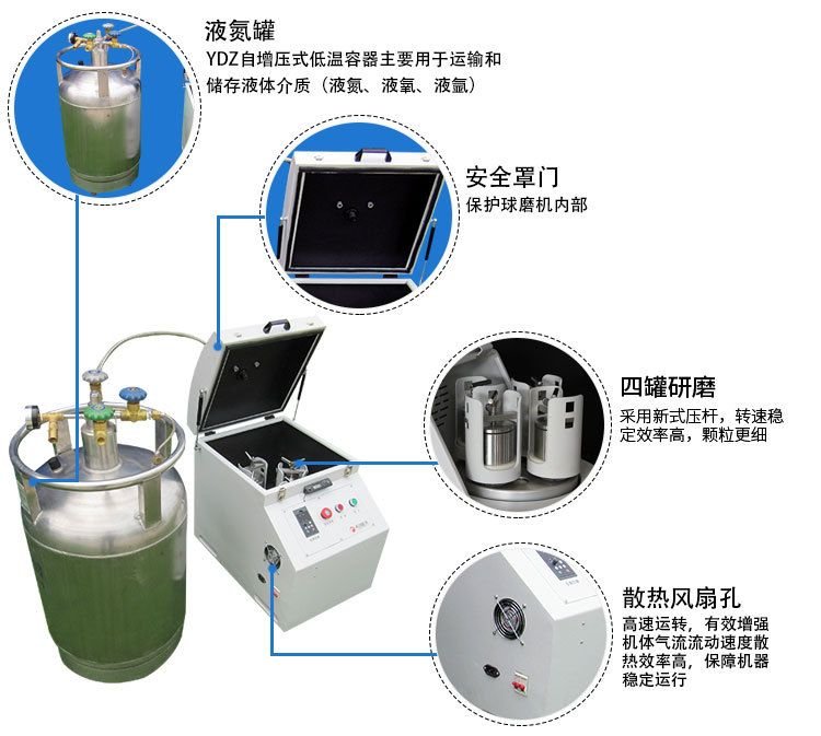 一、液氮行星式球磨机|冷冻行星球磨机简介液氮行星式球磨机|冷冻行星球磨机是将球磨罐放置在装有保温罩的环境中,通过液氮气体源源不断地输入,将高速旋转的球磨罐产生的热量及时吸收,使装有物料、磨球的球磨罐始终处于一定的低温环境中。是混和、细磨、小样制备、新产品研制和小批量生产高新技术材料的必备装置。二、液