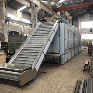物料由加料器均匀地铺在网带上,网带采用12-60目不锈钢丝网。由传动装置拖动在干燥机内移动。干燥机由若干单元组成,每一单元热风独立循环,部分尾气由专门排湿风机排出,废气由调节阀控制,热气由下往上或由上往下穿过铺在网带上的物料,加热干燥并带走水分。网带缓慢移动,运行速度可根据物料温度自由调节,干燥后的成品连续落入收料器中。上下循环单元根据用户需要可灵活配备,单元数量可根据需要选取。