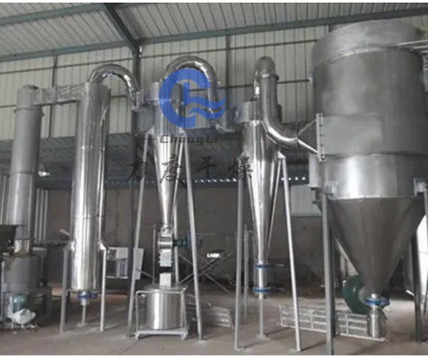 干燥后的成品从旋风分离器排出,一小部分飞粉由旋风除尘器或布袋除尘器得到回收利用。Q型气流干燥器是负压操作,物料不经过风机;QG型气流干燥器是正压操作;物料经过风机带有粉碎作用;FG型气流干燥器是尾气循环型;JG型气流干燥器是强化型气流干燥器,其集闪蒸干燥 与气流干燥为一体。