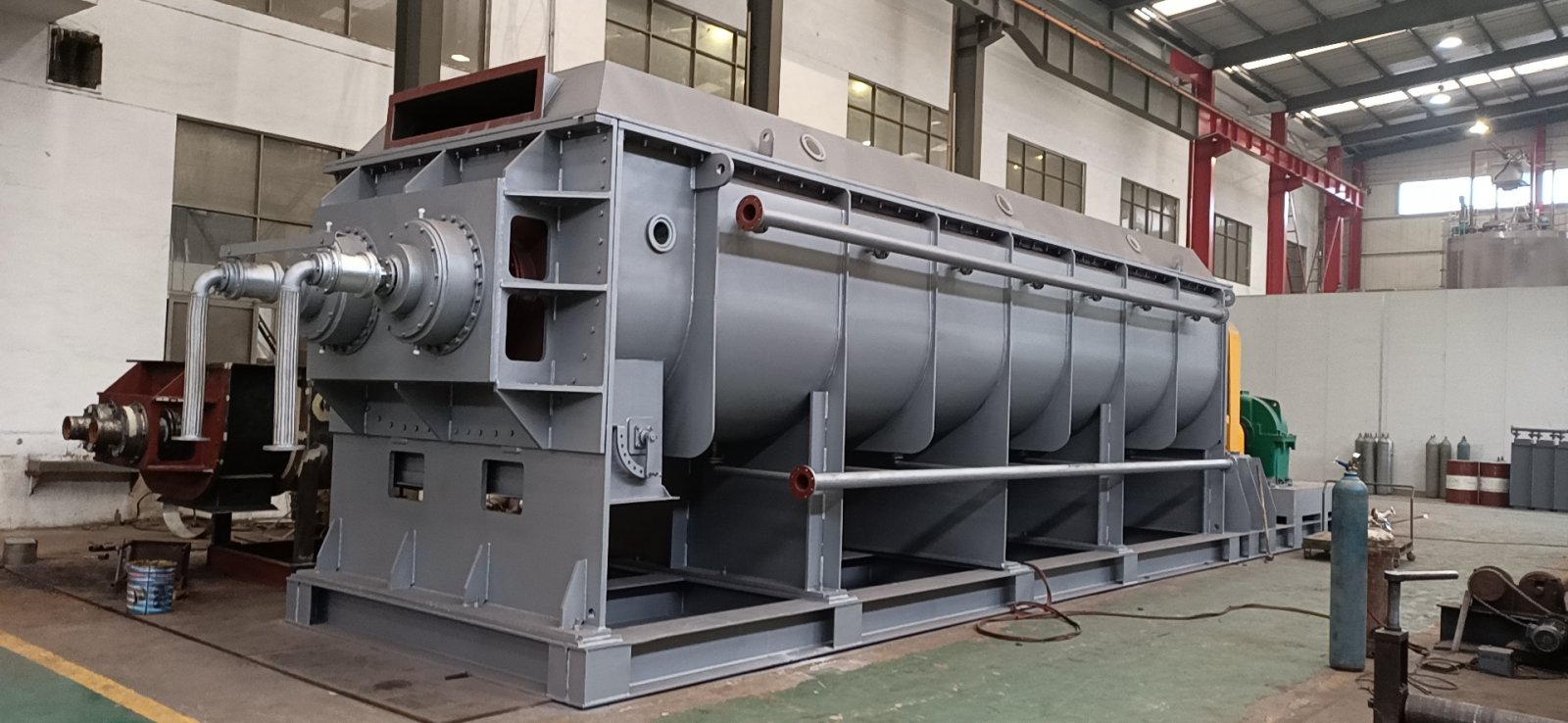 空心轴上密集排列着楔型中空浆叶,热介质经空心轴流经浆叶。单位有效容积内传热面积很大,热介质温度从-40℃到320℃,可以是水蒸汽,也可以是液体型:如热水、导热油等。间接传导加热,没有携带空气带走热量,热量均用来加热物料。热量损失仅为通过器体保温层向环境的散热。楔型浆叶传热面具有自清洁功能。物料颗粒与楔型面的相对运动产生洗刷作用,能够洗刷掉楔型面上附着物料,使运转中一直保持着清洁的传热面。浆叶干燥机的壳体为Ω型,壳体内一般安排二到四根空心搅拌轴。壳体有密封端盖与上盖,防止物料粉尘外泄及收集物料溶剂蒸汽。出料口处设置一挡扳,保证料位高度,使传热面被物料覆盖而充分发挥作用。传热介质通过旋转接头,流经壳体夹套及空心搅拌轴,空心搅拌轴依据热介质的类型而具有不同的内部结构,以保证**的传热效果。干燥目的。
