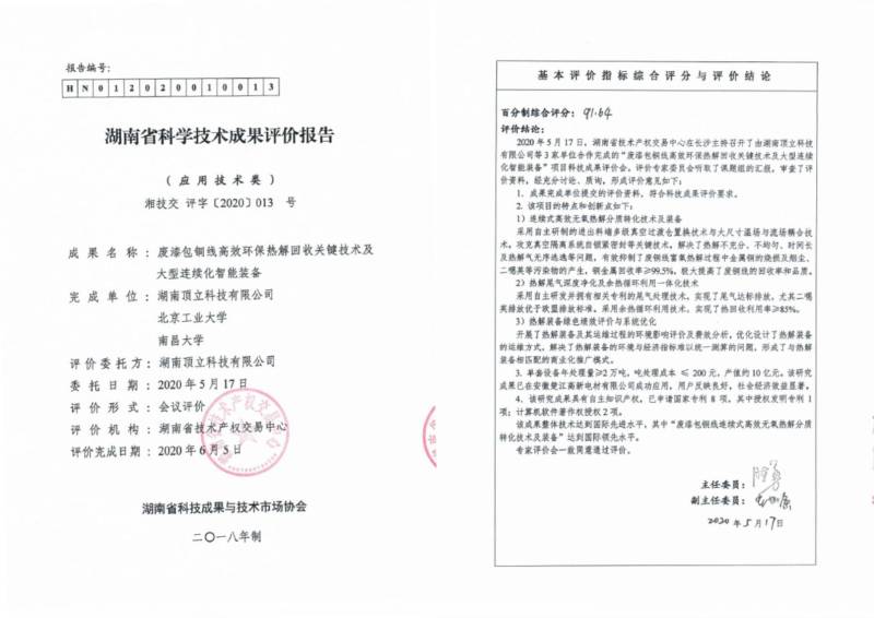 2020年,经由中科院广州能源所陈勇院士为主任委员等十位专家评价认定:“废漆包铜线高效环保热解回收关键技术及大型连续化智能装备”整体技术达到国际**水平,部分达到国际**。