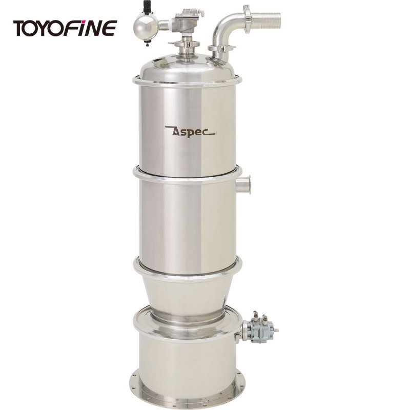 真空上料机料斗的出料口直径160,料斗角度约70度,所以不容易产生架桥现象,几乎所有的输送原料都能顺利排出,不需要辅助排出装置过滤器是双重(W过滤器)的,连微粉的收集也毫无遗漏。一道过滤是毡布,二道过滤器使用的是经过特殊加工的机织布滤芯型。双重过滤器就2次防止过滤器的堵网,也能防止清洗过滤器时脉冲反吹的气雾混入。