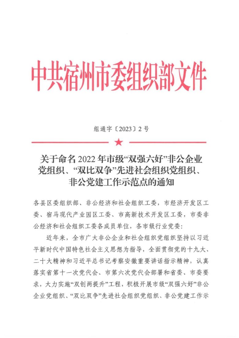 热烈祝贺安徽儒特实业有限公司党支部荣获宿州市委组织部“双强六好”党支部荣誉称号!安徽儒特党支部是灵璧开发区中获得此殊荣的两个党支部之一,这是全体党员的荣誉也是全体党员共同努力的结果。“双强六好”是非公企业党组织示范建设的重要标准,“双强”是指发展强、党建强;“六好”则是指生产经营好、企业文化好、劳动