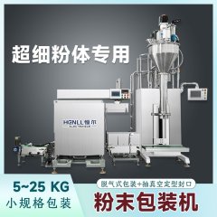 超细粉脱气式螺旋包装机应用与特点 超细粉脱气式螺旋包装机,用于 10~50kg/袋的物料包装,能自动完成物料脱气装袋、过程除尘等工作,广泛适用于矿产、磷酸铁钮、三元材料、石墨粉等正极、负极新能源材料、工建材、粮食、饲料等行业,尤其适用于要求物料含气量大或流动性差的小袋包装。 设备优点简述 采用专用脱气、排气装置,保证物料填充密实度及大幅减少粉尘。 2内部结构均做处理,避免掉落异物的风险。 夹袋器可调高度,适用不同包装规格。 采用马达带动称重升降机构升降,底部开始充填,保证充填过程基本无粉尘扬出。通过负压系统自动将充填入袋过程中产生的微量浮尘收集于集尘器中,并定期开阀卸料于包装机料仓,完成自动除尘回料功能,实现充填过程中的无尘化。 HEF-25A超细粉脱气螺旋包装机的技术参数和特点,包括主体材质、计量方式、操作界面、脱气功能、料仓容积、包装重量、输送高度、充填效率、包装精度、包装袋尺寸、电源、包装机功率、耗气量、前端对接、电控系统、复称皮带线等。其中,主体材质为304不锈钢,设备外露部件避免使用铜、锌材质,与物料接触静态喷涂PTFE0.03mm,动态接触喷涂WCO.2mm,垂直脱气螺旋充填+电子下称重,触摸屏人机界面,垂直脱气螺旋,料仓容积120L,包装重量5-50KG,输送高度2750土30mm,充填效率40~60包/小时(按25kg/包),包装精度土50g,包装袋尺寸宽450-550mm;长900-1000mm,电源380V50Hz,包装机功率9Kw,耗气量0.5~0.8MPa.0.3立方/小时,包装机入料口管径DN150,高度2750mm,电控柜防护等级IP55,采用下进线方式,柜外接三色报警灯,重量实时显示重量。 下载本篇解决方案: