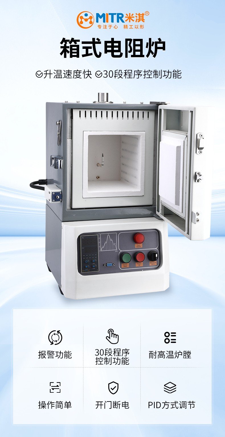 MITR-1200 x-7.2L以瑞典康耐尔电阻丝为加热元件,采用双层壳体结构和30段程序控温。K型热电偶,炉膛采用氧化铝微晶体纤维材料,双层炉壳间配有风冷循环系统,**温度能达到1200℃,可连续工作1100℃,控温精度±1℃;该炉具有温场均衡、表面温度低、升降温度速率快、节能等优点,是高校、科研院所、工矿企业做高温烧结、金属退火、质量检测用的理想产品。