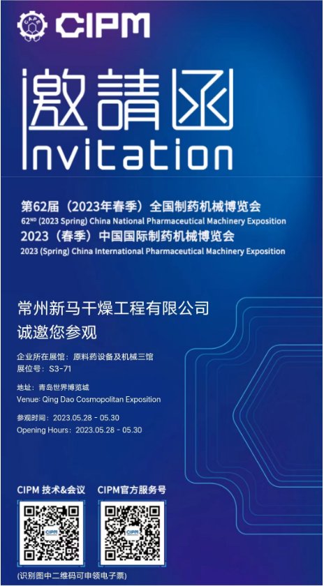 第62届(2023年春季)全国制药机械博览会暨2023(春季)中国国际制药机械博览会将于2023年5月28至30日在青岛世界博览城展馆拉开序幕。届时,常州新马干燥工程有限公司将在原料药设备及机械3馆S3-71恭候大驾,期待您的光临! 常州新马干燥工程有限公司多年来致力于(闭路循环,高速离心,中药浸
