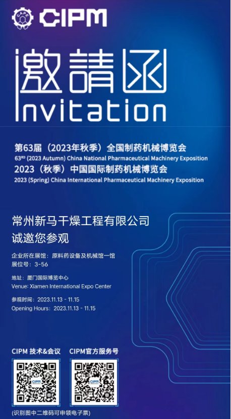第63届(2023年秋季)全国制药机械博览会暨2023(秋季)中国国际制药机械博览会将于2023年11月13至15日在厦门国际博览中心拉开序幕。届时,常州新马干燥工程有限公司将在原料药设备及机械馆一馆3-56恭候大驾,期待您的光临!常州新马干燥工程有限公司多年来致力于(闭路循环,高速离心,中药浸膏,