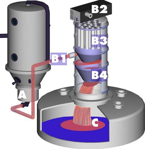1、气动控制器控制真空泵B2启动在分离舱内产生真空,迅速将空气和物料从A(进料位置),经软管或管子和B1(吸料口)进入到B4(真空输送设备)中,从而达到输送物料的目的。