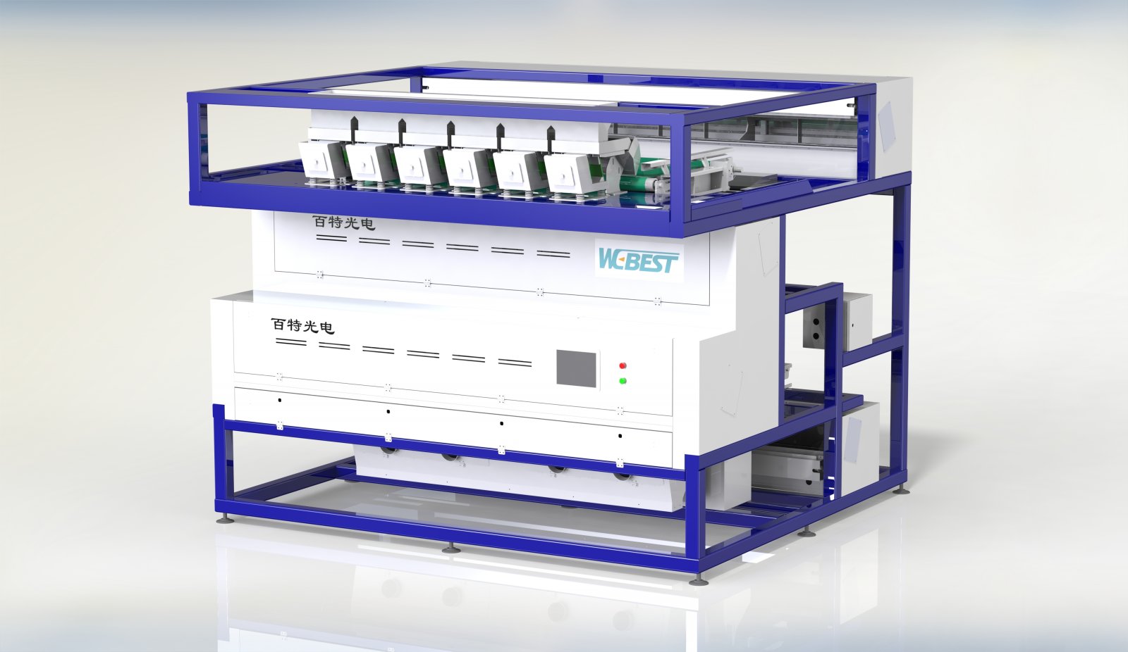 9. 定制分选结构: 根据不同矿石分选要求,推出单层、双层、单视、双视等多种机型组合;其中双层结构可以实现上层分选的物料,能够到下层再次复选,色选精度更高。