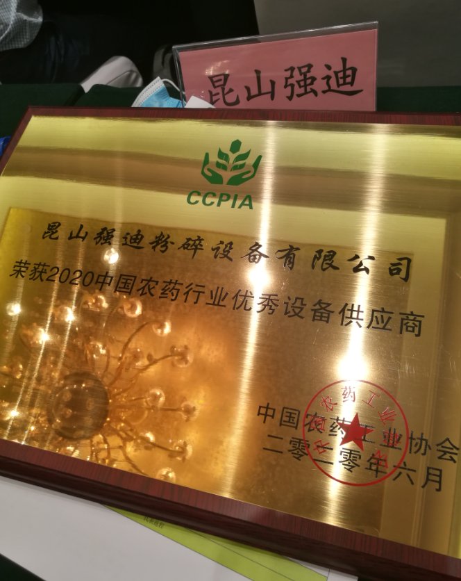 2020年6月12日,由中国农药工业协会主办的“金旺论坛”第五届中国农药行业供应链和采购管理研讨会暨中国农药行业供应链和采购管理工作委员会扩大会议在江苏常州拉开帷幕。昆山强迪粉碎设备有限公司(以下简称“强迪粉碎”)荣获“2020中国农药行业优秀设备供应商”称号,是公司多年坚持“以质量求生存,以创新求发展,以客户需要为依据,以合作共赢为结果”企业宗旨的最好见证。