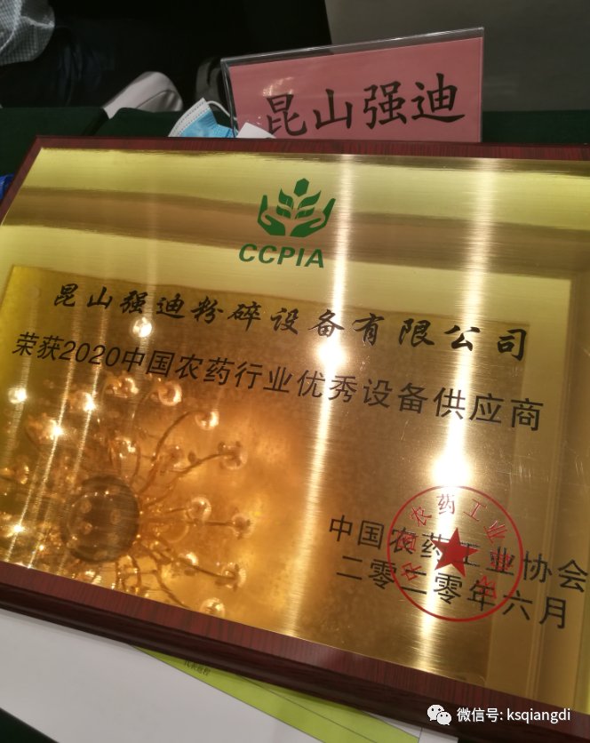 “2020年6月12日,由中国农药工业协会主办的“金旺论坛”第五届中国农药行业供应链和采购管理研讨会暨中国农药行业供应链和采购管理工作委员会扩大会议在江苏常州拉开帷幕。昆山强迪粉碎设备有限公司(以下简称“强迪粉碎”)荣获“2020中国农药行业优秀设备供应商”称号。