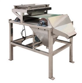 本除铁器由分选磁辊、张紧辊、传动胶带、分隔板和下料斗组成,物料由可调节下料均匀进入传动胶带后被带至分选磁辊,非磁性物料在离心力和重力的复合作用下呈 抛物线轨迹落入非磁性产品接料槽中,磁性物料在磁力的作用下被吸附在分选磁辊区的传动胶带上,随着分选胶带的转动逐步带离磁辊区后进入磁性产品接料槽中, 从而达到两者分离的目的。
