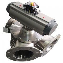 三通换向阀(又称三通分路阀、三通换向器),是应用于固体物料(粉料、颗粒料、粉粒混合料、片状料)输送系统中用于切换管道中物料流向的专用设备,三通换向器三个通道呈角度布置,一进两出或两进一出,通过电磁阀的切换来控制气动执行器的驱动。阀芯动作的两个位置由限位检测开关进行检测,限位检测开关直接装在气动执行器上面。阀正常工作时,阀芯转到一个位置。换向指令发出后,转到另一个位置,至此换向动作完成。