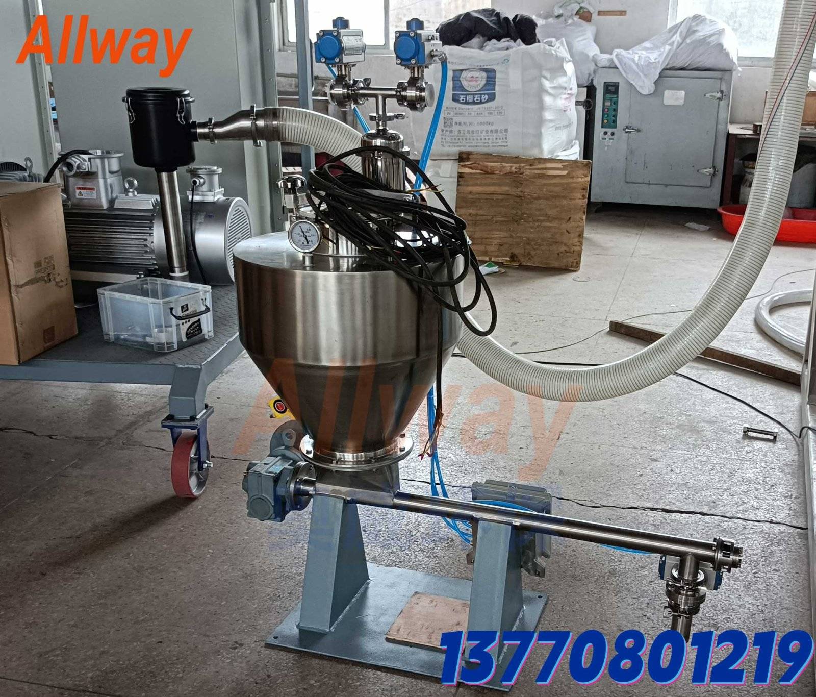 3、气动控制器控制真空泵关闭时,输送器内的压力达到平衡,物料经出料仓输送到下一个料仓(或反应釜、混合机等)的位置。