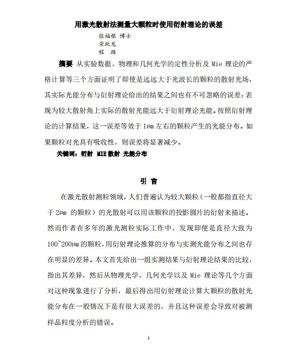 摘要从实验数据、物理和几何光学的定性分析及 Mie 理论的严格计算等三个方面证明了即使是远远大于光波长的颗粒的散射光场,其实际光能分布与衍射理论给出的结果之间也有不可忽略的误差:表现为较大散射角上实际的散射光能远大于衍射理论光能。按照衍射理论的计算结果,这一误差等效于 1µm 左右的颗粒产生的光能分