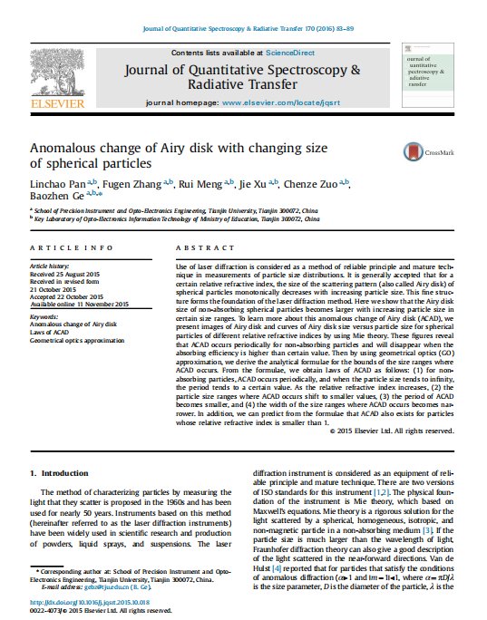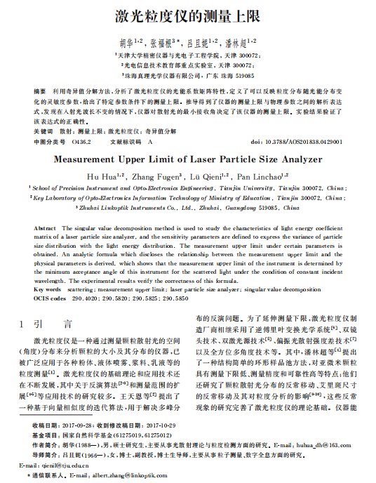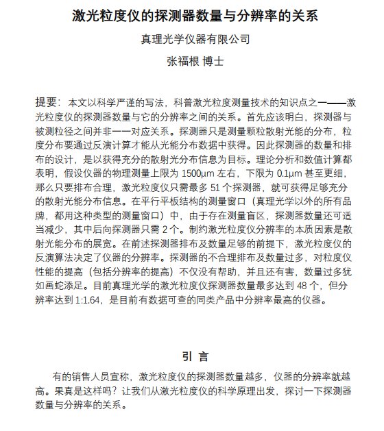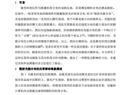 摘要 基于Mie散射原理的激光粒度仪是颗粒测量领域应用最广泛的仪器之一。通常情况下颗粒越小,散射角越大,激光粒度仪探测器阵列接收到的散射光能分布的主峰位置越靠外。但是,对特定相对折射率的颗粒,在某些粒径区间,散射光能分布的主峰位置会随着颗粒粒径的减小而向探测器阵列的内侧移动,称之为散射光能分布的反常