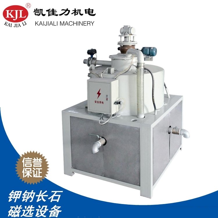 在螺旋紫铜线圈包围的工作腔内,放置装有一定数量的磁介质网。硅整流控制系统将工作交流电源转变为直流励磁电源。线圈通电后,磁介质网被磁化,其表面产生不均匀的磁场--高梯度磁场。被分选的物质通过工作腔的磁介质时,磁性物质受磁场力被吸附在磁介质上,非磁性物质从工作腔通过,从而达到将磁性物质和非磁性物质分离的目的。