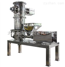 该机有粉碎主机、旋风分离器、脉冲除尘箱等部分组成。物料由加料斗进入粉碎室,通过高速气流吹搅物料使之相互撞击和摩擦而进行粉碎,粉碎细度可调节分级刀与分级盘的距离来达到所需要的细度,粉碎好的物料经转离心力和引风机的作用进入旋风分离器,然后,通过关风机出料,粉尘进入脉冲除尘器,经过防静电除尘布袋过滤后回收利用。该机按“GMP”标准设计,整机全部用304不锈钢材料制造,粉碎过程中无粉尘飞扬。