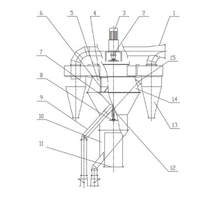 1、调节阀 2、调速电机 3、主轴 4、进料口 5、风岔管 6、上转子 7、旋风筒 8、选粉室 9、撒料盘 10、下转子 11、滴流装置 12、细粉出口(单锁风阀) 13、粗粉锥 14、粗粉出口(双锁风阀) 15、风机