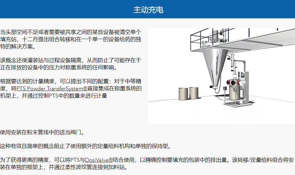 当有足够的高度可用时,可以通过重力进行填充;如果设备下方的顶部空间有限,或者要通过一个灌装站清空多台过程设备,则可以在偏远的位置进行灌装。在这种情况下,将结合使用PTS Powder TransferSystem® 和定量单元DosiValve®来准确地分配粉末。