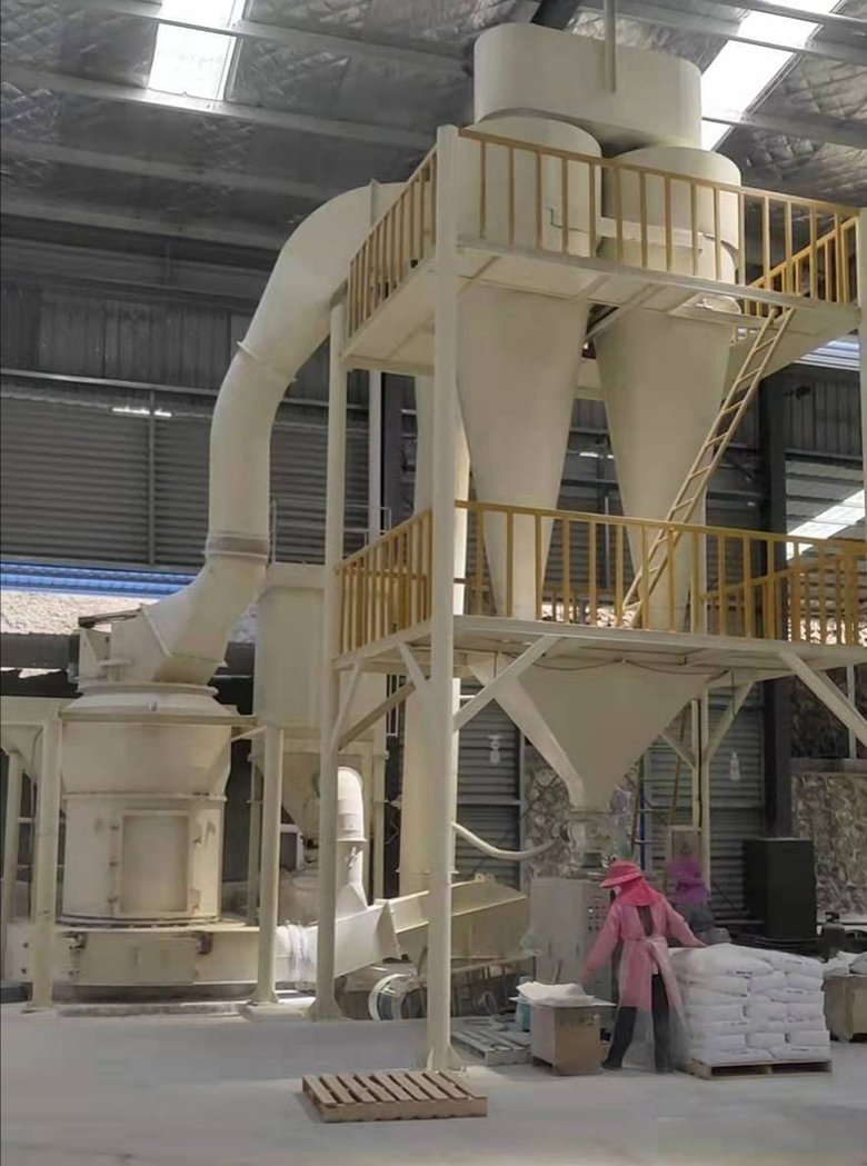 需要加工物料进入主机研磨室后,由于主轴旋转时离心力的作用,磨辊向外摆动,紧压于磨环,铲刀将物料铲起送至磨辊与磨环之间,随磨辊的滚动而达到研磨、粉碎目的。物料经过研磨后,粉末随着鼓风机循环风经过分析机进行分选,细度过粗的物料落回研磨室重磨,合格细粉则随气流进入旋风集粉器,经出粉管排出即为成品。气流通过旋风集粉器后又进入鼓风机形成闭路循环,从而使机器连续正常工作。余风则可以通过余风管进入除尘器经净化后排出机外。