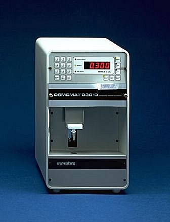 纯水冰点为0℃,而浓度1Osmol/Kg 食盐水冰点为-1.858℃。总渗透压值计算,就是测量样本溶液与纯水冰点之不同,将两者冰点值作比较,即可精确计算结果。OSMOMAT030 采用Peltier 冷却系统,先将样本温度降至冰点,再由第2 组冷却系统产生和针尖大小的细微冰晶,迅速插入样本液产生结晶。透过精密温度感应器,侦测极小的温差变化,微电脑立即计算渗透压值,此过程在1 分钟内迅速完成!
