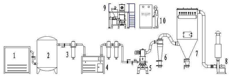 1、空压机 2、储气罐 3、精密过滤器4、冷冻干燥机 5、MQW型气流磨 6、旋风分离器(选配) 7、脉冲袋式收尘器 8、离心引风机 9、原料仓 10、控制系统