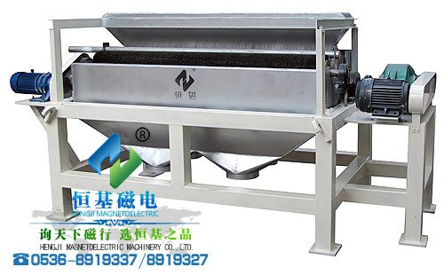 其原理为物料经料仓通过导料盘进入磁场区,磁性矿物被吸附在磁辊表面旋转到达精矿区,毛刷将吸附在磁辊表面上的磁性矿刷脱,在高压水的喷射下落到精矿斗里,部分未被吸附的磁性矿粒、非磁性矿粒和磁性较弱的矿粒进入到下一级再选。