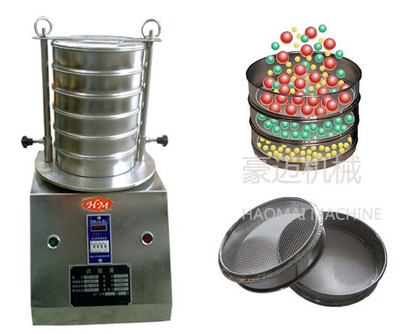 标准振动筛机是以电磁振动器作为振动源的,电磁振动器振动带动筛机底座振动,再通过底座传导到安放在底座上的一套从粗到细排列的标准试验筛,上下高频颤动,同时安装在下部的振动电机(或往复机构)使物料摊开。物料在标准检验筛筛面上振动,使小于试验筛筛面网孔的物料颗粒筛分进下层试验筛,如此层层筛选,使每层试验筛内只留相同粒度的物料。达到不同粒度的分离并确定此物料的粒度组成。这种筛机可放置1-7层试验筛,使试验筛中的物料能有效地筛分、分级、过滤。由于筛面能高频上下颤动,使物料能从网孔中甩出,物料很少粘网,提高了细物料的筛分效率,干筛正常使用,能筛分至20um(635目);增加我公司设计的负压装置,能干筛筛分物料至5um。解决了超细微粉干筛的难题,