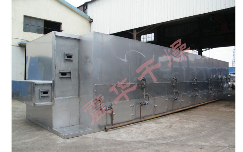 用于脱水蔬菜,一般使三台设备串联使用,形成初干段、中间段及终干段。在初干段中,由于物料含水量高,透气性差,故应采用较小的辅料厚度,较快的运行速度及较高的干燥温度。初干段中,干燥气体温度可高达120℃以上。终干段内物料停留时间是初干段的3-6倍,铺料厚度是初干段的2-4倍。对于物料温度不超过60℃的要求,可采用80℃左右的干燥气体。采用多段组合能更好发挥带式干燥机的性能,且干燥更均匀。