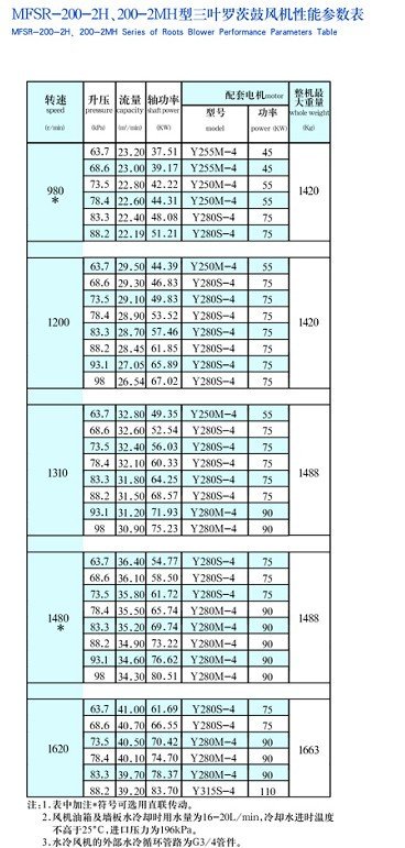 罗茨鼓风机的转速为150~3000转/分钟,流量为0.15~1200立方米/分钟,压力为9.8~196千帕,功率为0.75~1000千瓦,单机重量为100~9000千克。