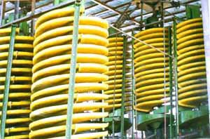 将螺旋溜槽立起,校准垂直线,用铁架或木头固定在合适的位置,由砂泵将矿砂送到螺旋上顶两个进料口处,加入补充水,调节矿桨浓度,矿桨自然从高往下旋流,在旋转的斜面流速中产生一种惯性的离心力,以矿砂的比重、粒度、形状上的差异,通过旋流的重力和离心力的作用,将矿与砂分开,精矿流入精矿斗用管道接出,尾砂流进尾砂斗用管道接到砂池,再用砂泵排走,完成了选矿的全过程。