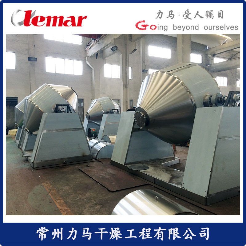 双锥回转真空干燥机是集混合—干燥于一体的新型干燥机。将冷凝器,真空泵与干燥机配套,组成真空干燥装置。(如不需要回收溶剂,冷凝器可不用)本机设计先进,内部结构简单,清扫容易,物料能全部排出,操作简便。能降低劳动强度,改善工作环境。同时因容器本身回转时物料亦转动,但器壁上不积料,故传热系数高,干燥速率大,不仅节约能源,而且物料干燥均匀充分,质量好。可广泛应用于制药、化工、食品、染料等行业的干燥。